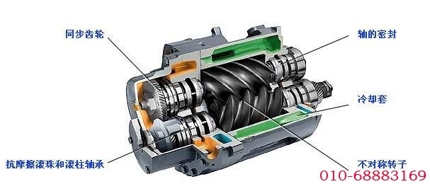 双螺杆空压机主机(又称机头)的结构通常是由一对相互啮合的齿轮(螺杆、主机壳体、高压端及端盖和低压端及端盖)组成。螺杆式空压机主机正常运行时,螺杆与螺杆之间、螺杆与主机壳体及高低压端面之间都是不接触的(有微小的间隙由空压机油来填充)。
